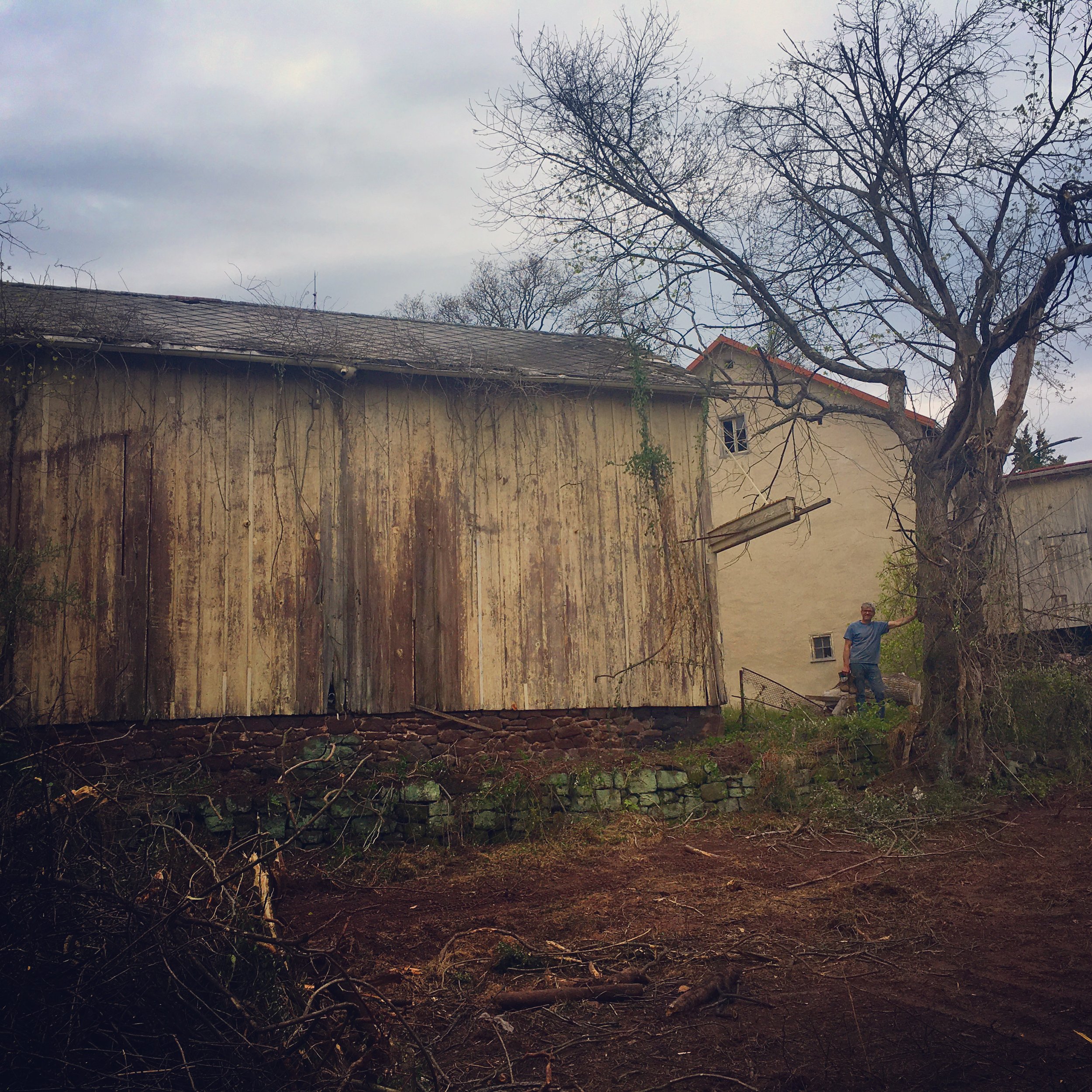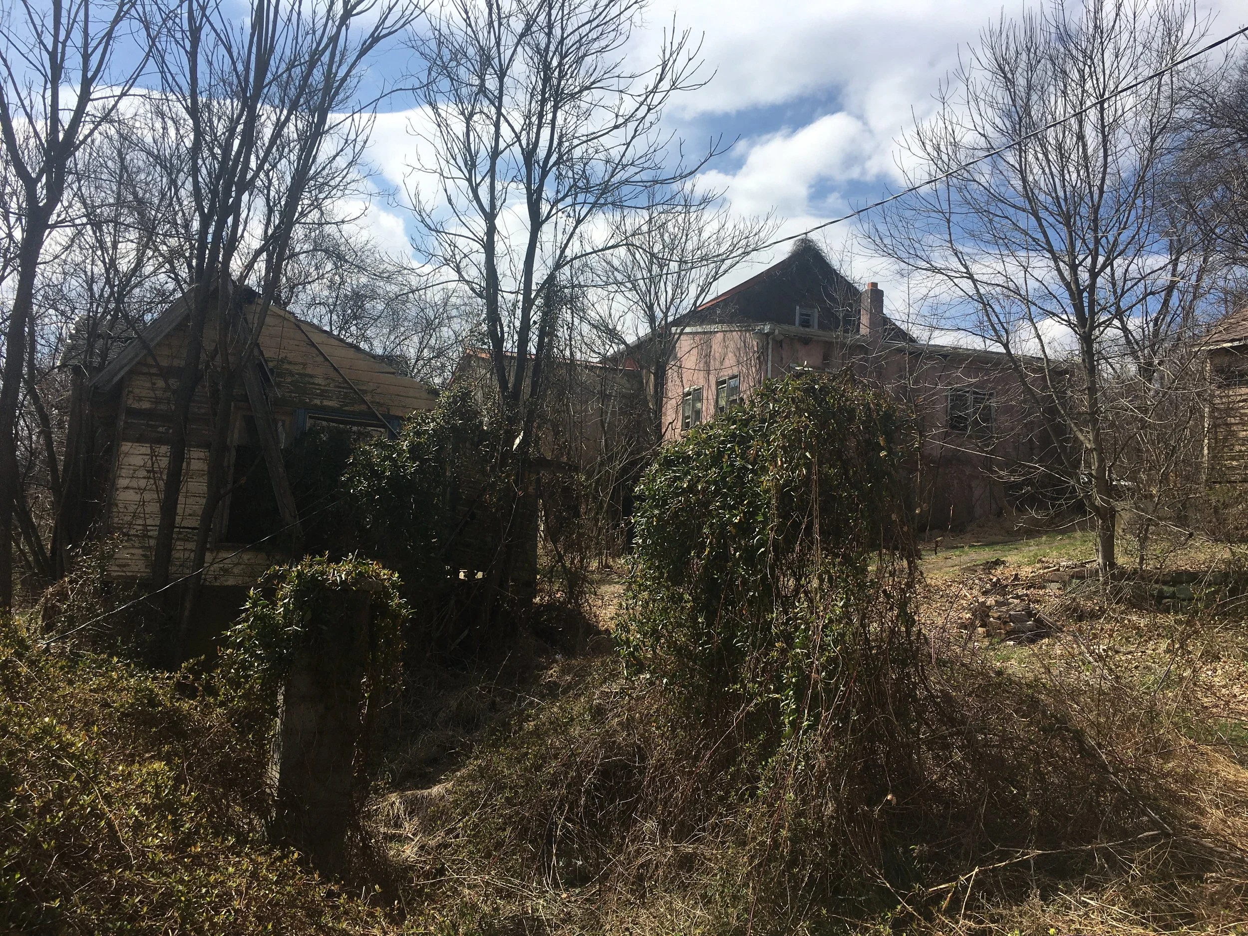 View of the Farmhouse (under construction, mid 2020); the delipidated chicken house and pig barn we removed to the foundations.